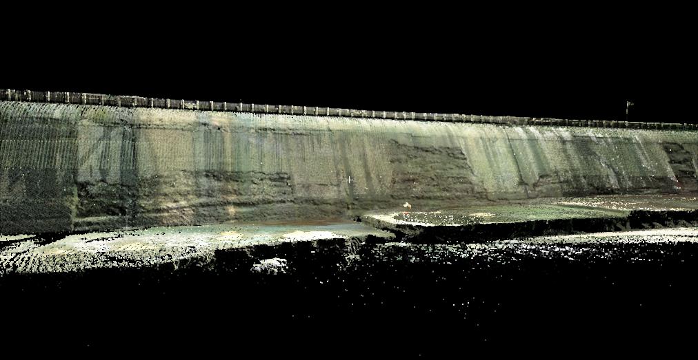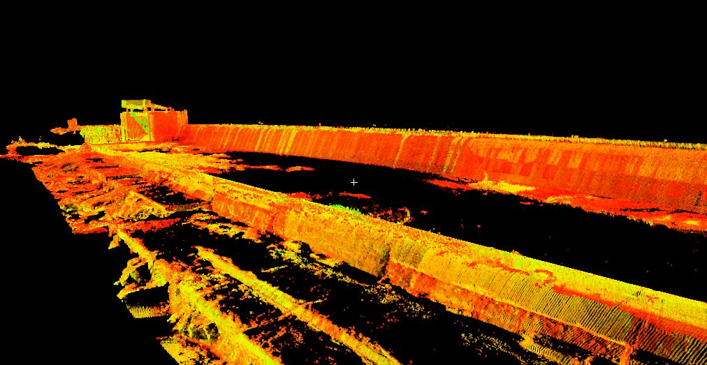 The point cloud consisted of over 16 million points and was registered over a seamless panoramic digital photo allowing engineers to visualize and quantify the cracks and spalling in the Dam. Mapping was performed in Leica’s Cloudworx and a 3-D model of the dam was created. Isometric views were mapped as well as 142 cross sections, a Digital Terrain Model (DTM) and Topographic Contour Map across the face of the dam. Some of the areas of spalling and cracks were big enough to fit a person inside of them.